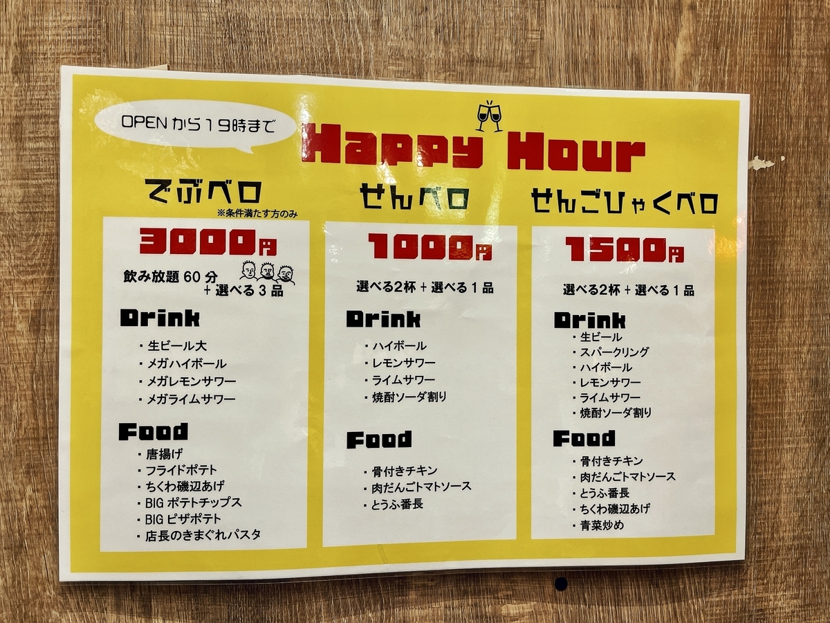 ハッピーアワーも利用しずらい!お店の都合で飲み物と食べ物をつけ合わせたいんだろうけど・・・飲み物だけにした方が良いね!「〜ベロ」とかでなく、常時「60分飲放題/1000円」「90分飲放題/1500円」くらいにしないとライバル店が前の目にある中での闘い方は他にないだろうってね勝手に思ったりもするな〜このクオリティーなら!「角打ち」みたいにして単価下げ!ターゲットをハッキリとさせ!満員御礼になるようにした方が良いと思います。