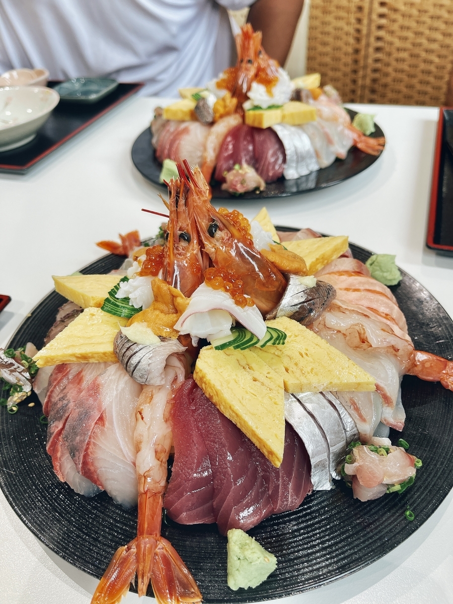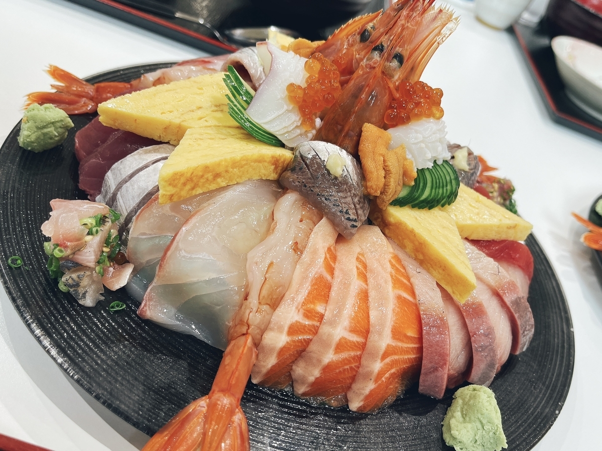 「海鮮丼特盛」の盛り付けもパーティーみたいで嬉しくなる〜映え全快!「マグロ赤身・中トロ」「ブリ」「タイ」「海老」「うに」「ホタテ」「米良サーモン」「イカ」「アジ」などなど秀逸に美味しい〜どれも究極の旨味で今まで食べたことない食感と美味しさを体感できます。