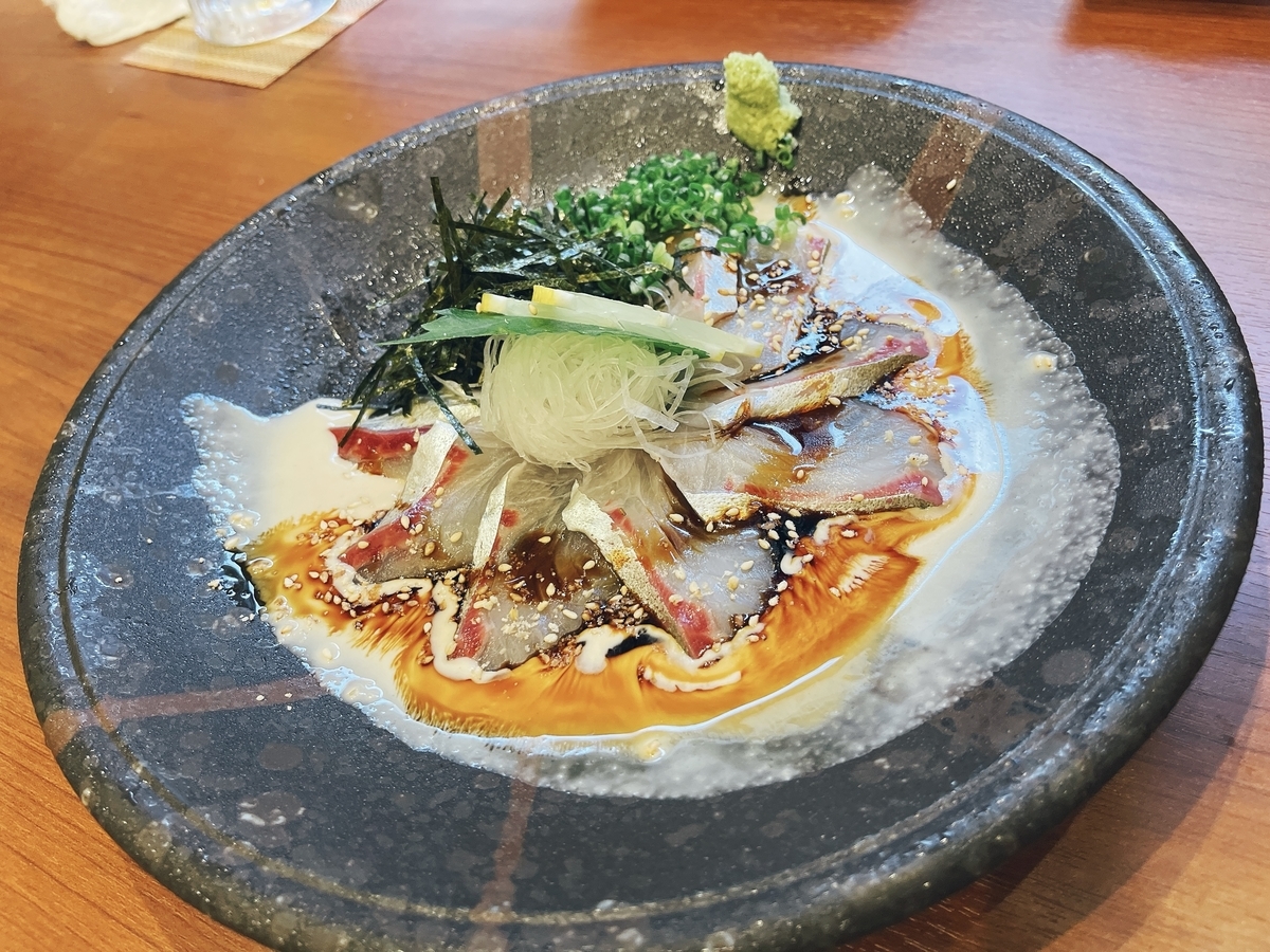 「胡麻鯖」でなく「胡麻シマアジ」は脂のりも良くねっとり胡麻ペーストが絡んで秀逸な美味しさ☆「胡麻カンパチ」もあるので好みでチョイスされたらよろしい〜新鮮な魚介類からお肉&ご飯類とメニュー豊富!で楽しめるオススメな居酒屋さんです〜ごちそうさまでした。