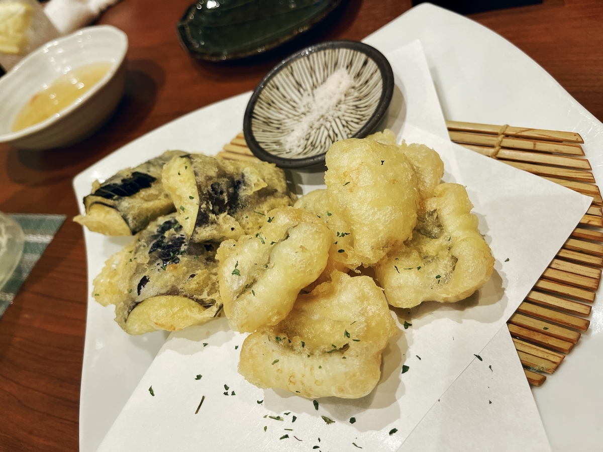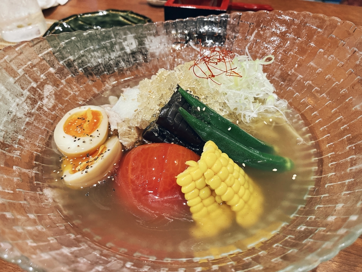 頂いたのは人気「冷やしおでん」や「胡麻シマアジ」に「刺し盛り」「とうもろこし天麩羅」「アナゴ天麩羅」「テール塩焼き」「糸島豚ポークソテー」などなど〜どれもハズレなく美味しい!やはり「冷やしおでん」は他にない美味しさ☆キンキンに冷えた「おでん」がなんともいい塩梅!ペアリングは冷やした日本酒(樽)がナイスマリアージュ!と老若男女に好まれる京都風味付けがGooD!オススメな逸品です。