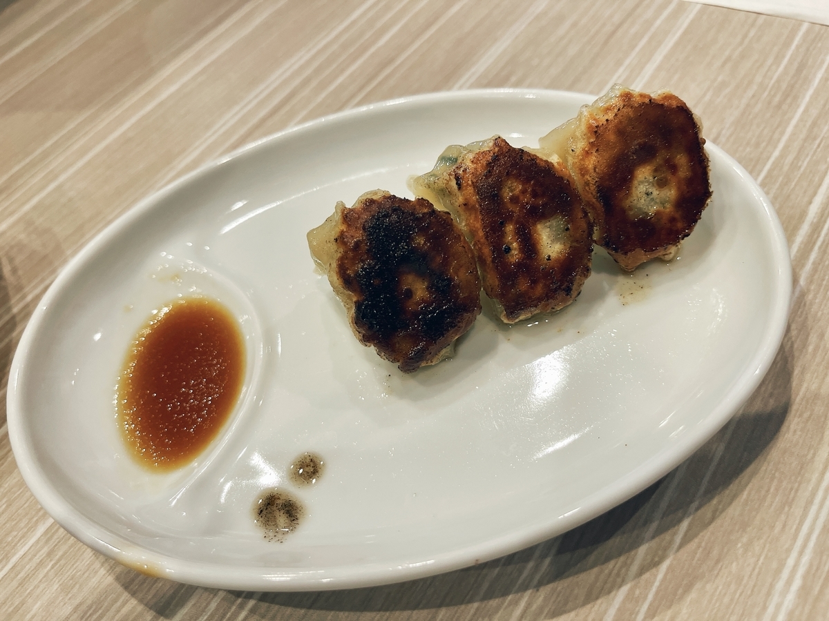 麺は低加水細麺!チャーシューは豚バラ薄切り!青ネギといったシンプルな構造です〜餃子は少し焦げが気になりました!高菜おにぎりは美味しかった。
