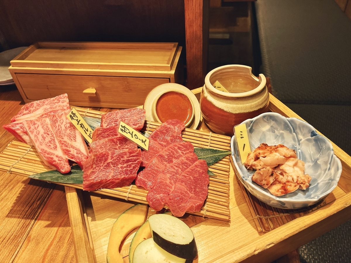 外観は雑居ビル1階!店内は集煙装置がついた炭火焼き台テーブルがあり!頂いたのは「ふじまき豪華コース」です。