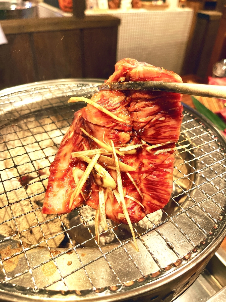 先ずは「キムチの3種盛り合わせ」「生ハム和風サラダ」に「牛タン」は外国産で大判薄切りサイズ!炭火なので火力は強い〜軽ーく炙って「塩レモン」でね!次に「ハツ刺」が配膳されてきた・・・焼きの前でなく「牛タン」を食べさせた後に「ハツさし」を食べさせたいこだわりがあるんだろうか?しかしながら・・・この「ハツ刺し」は鮮度も良く美味しかった。
