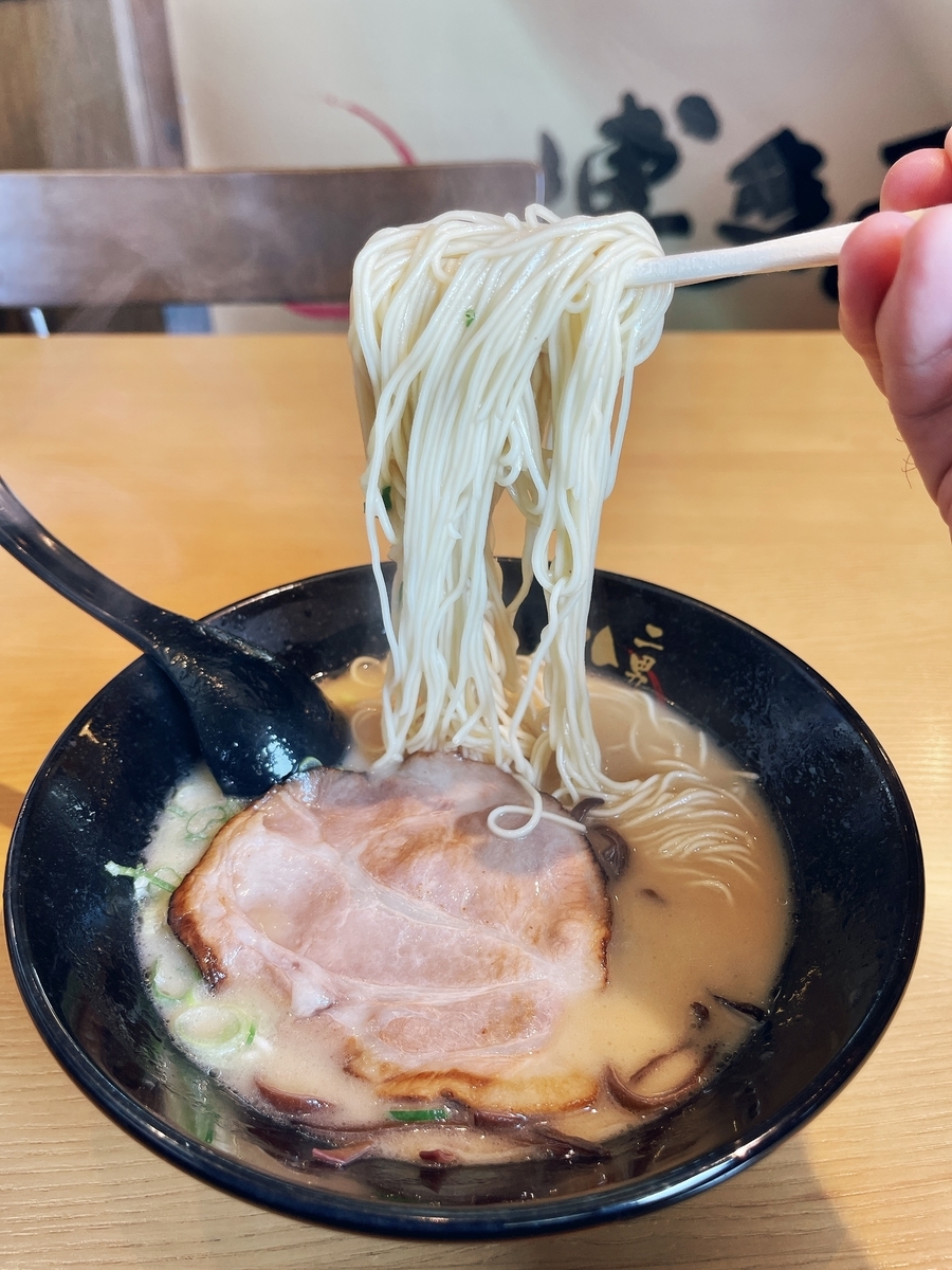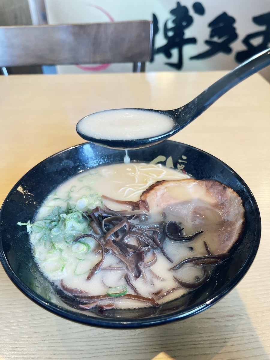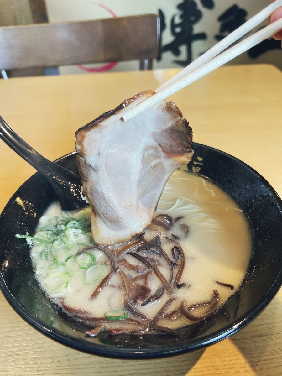 先ずはスープから〜おっクリーミー豚骨!でまずまずの美味しさ!ラード脂も多くなく!豚骨臭も控えめなので万人うけする「豚骨らーめん」でしょう〜ただ「かえし醤油」が甘いので好み分かれる一杯かも知れません!「麺」は低加水率細麺でパツンパツンと博多ラーメンらしい麺!「豚ロース炙りチャーシュー」は大判で美味しい!他にキクラゲと青ネギというシンプルなトッピングでした。