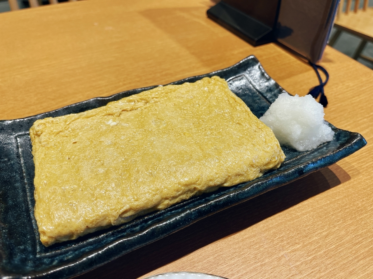 「蕎麦屋の玉子焼」は甘めなお出汁巻きたまご!単身だと物足りなさがあるが・・・大根おろしに醤油を合わせて一緒に食すと美味しく頂けました。