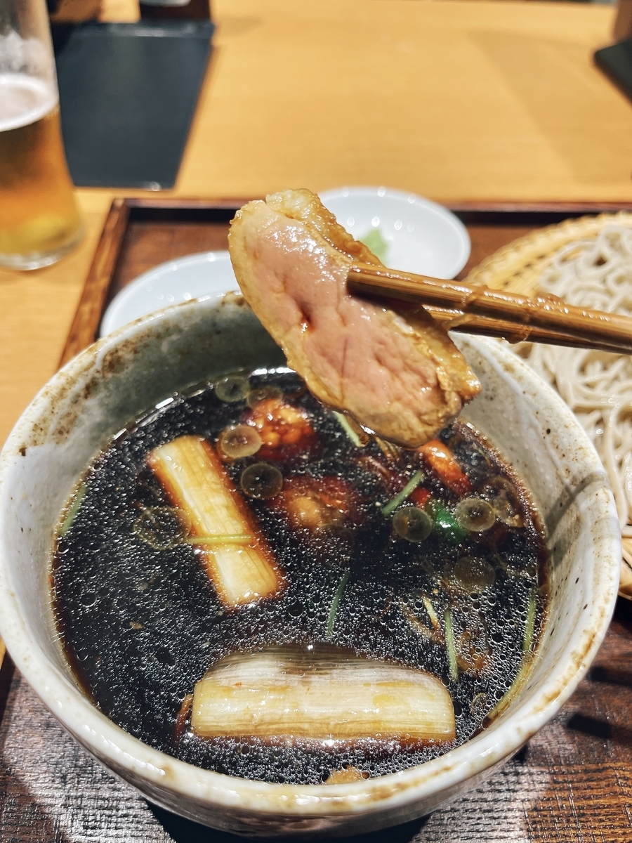 「鴨南蛮ざる十割」のまずは蕎麦のみで〜十割ですがしっかりとした麺線とコシは素晴らしいものがあります!蕎麦の香りは濃厚ではありませんが蕎麦好きには試してもらいたい・・・ただ蕎麦だけを愉しむために「塩」や「わさび」など薬味を用意してもらえるとありがたいなと思いました!つけ汁に蕎麦を浸してズズッと「うーん」蕎麦つゆがイマイチ決まっていない〜鰹節しっかりと昆布も今一歩効かせてほしい!醤油はキレがあって悪くありませんが・・・全体的な出汁の効かないボヤけた「つけ汁」なので蕎麦を合わせても物足りなさを感じます〜「鴨肉」は国産使用とのことでしたが「うーん」イマイチ脂乗り悪くパサついた肉質でした〜鴨肉ミンチは小ぶりでコチラもイマイチ!この値段を取るならもっと大きくふっくらと!そして美味しい鴨肉を使ってほしいと思いました。