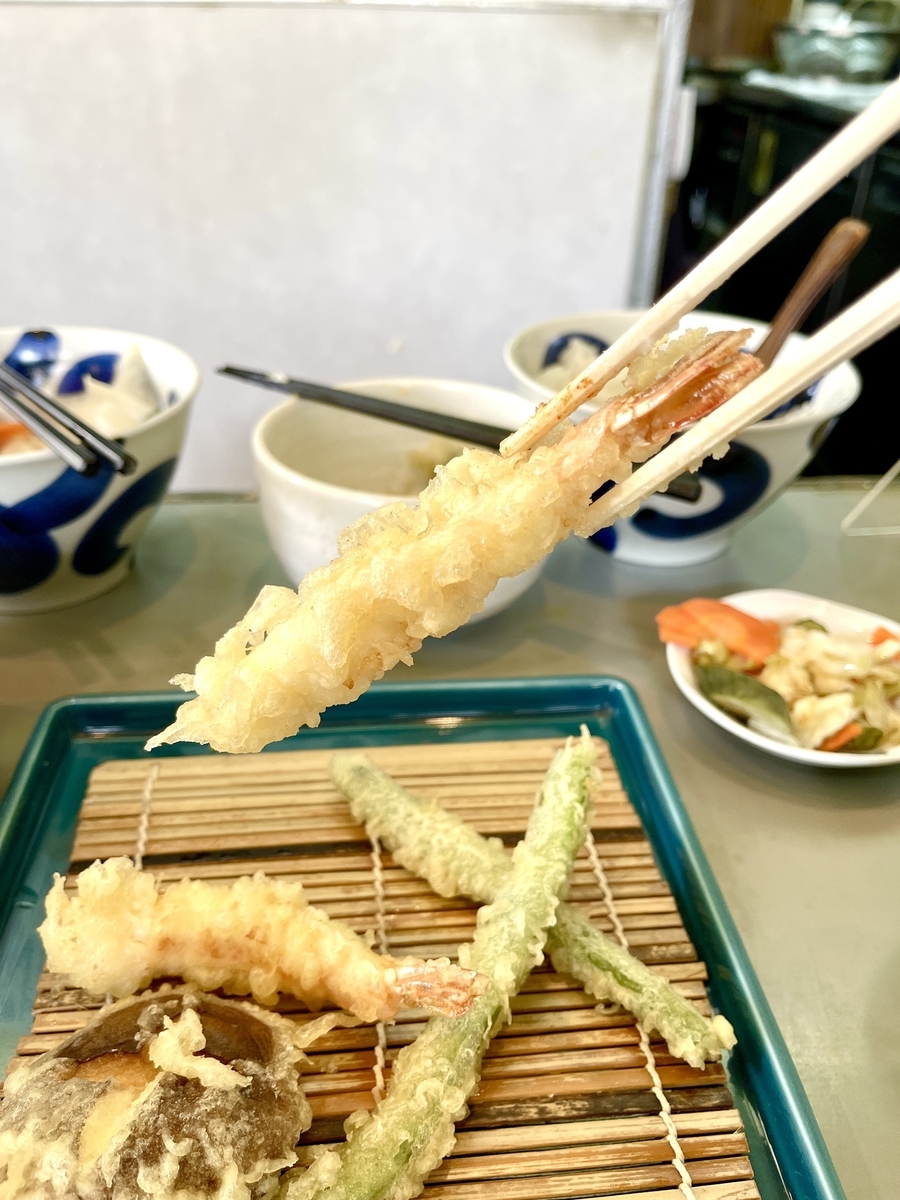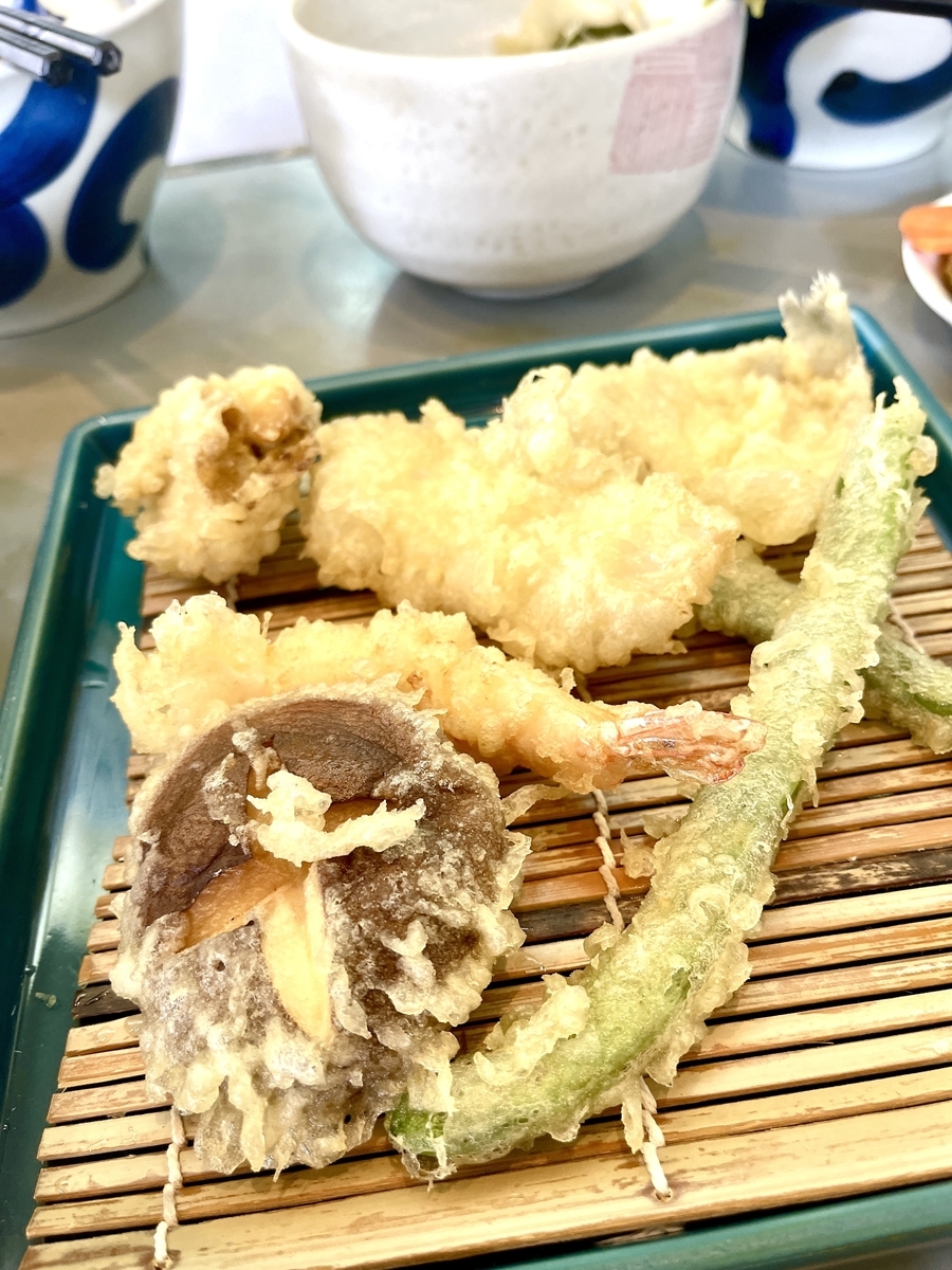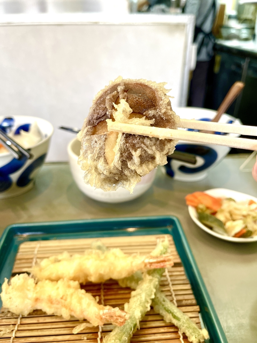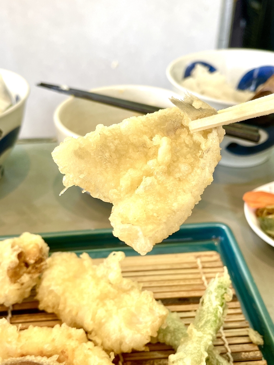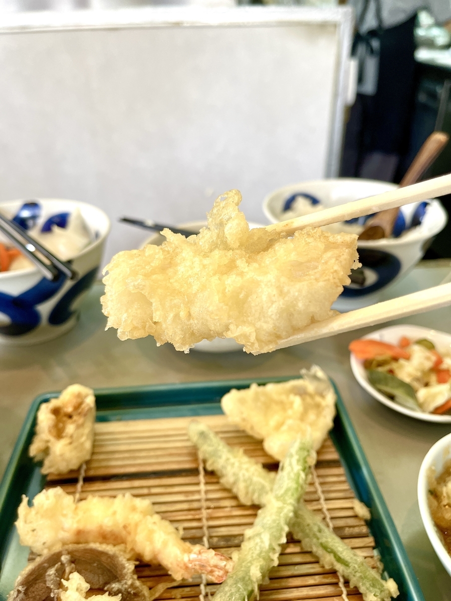 先ずは、「いんげん」「なす」「えび2尾」「椎茸」「イカ」「キス」「ホタテ」と揚げたてが次から次えと配膳されてきます!揚げ具合も完璧で美味しいわ〜何と言ってもたっぷりの「大根おろし」と「天つゆ」に浸して食べられるのが嬉しい!このお店が好きな理由の一つでもあります。