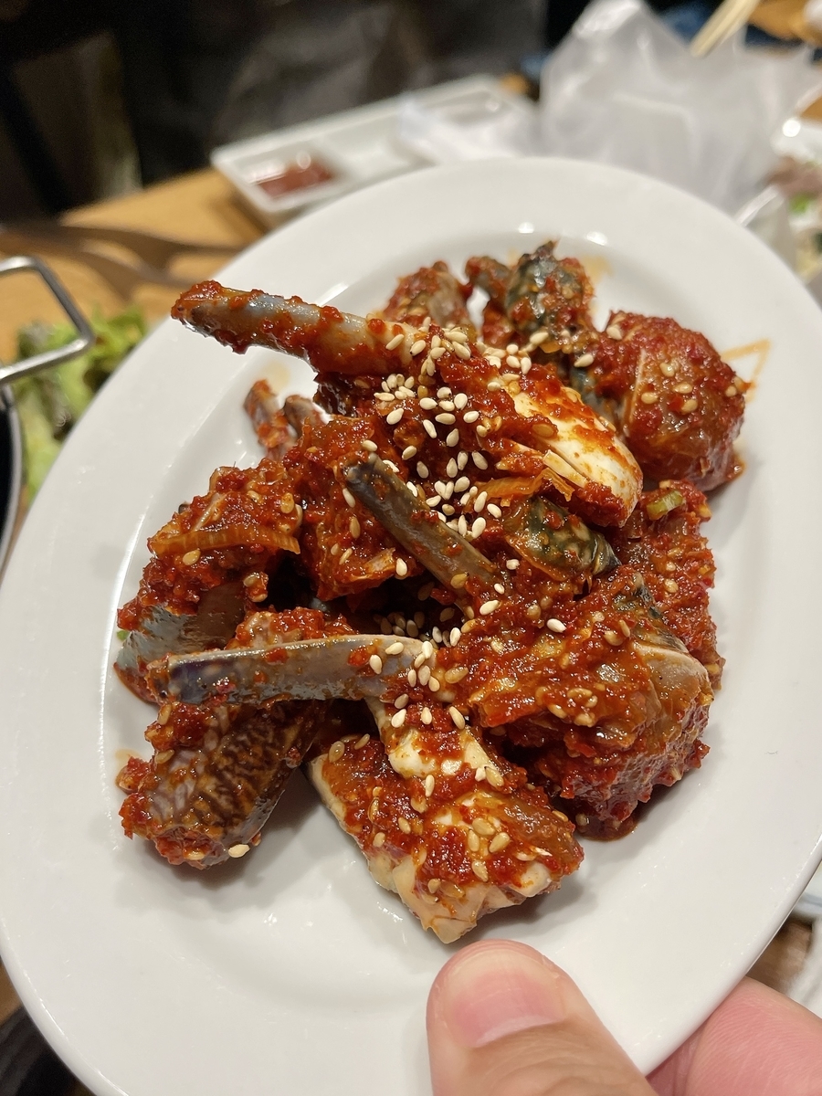 先ずは豚肉ホルモン「3種湯引き盛合せ」コブクロ、ハチノス、アゴ肉をサンチュにナムル&特製味噌と一緒に食べると美味しい〜いろんな食感が楽しめお酒のアテには最適です!そして蟹肉たっぷり「カンジャンケジャン」にカブリつく!なんとも言えない蟹の甘味が病みつきになります。