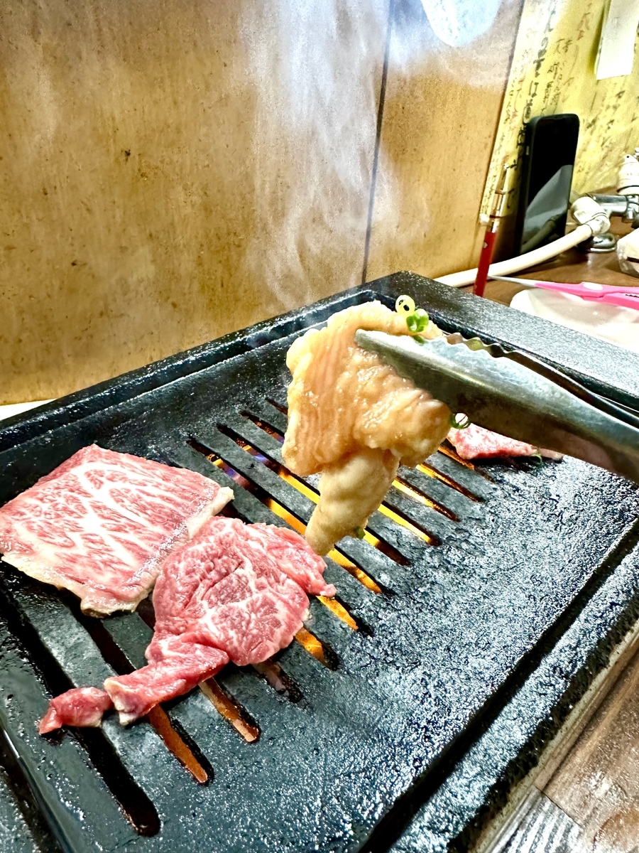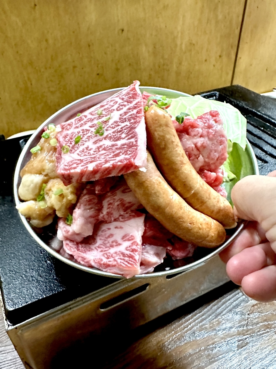 ドリンク1杯目「生ビール」ジョッキー!キンキン冷えでシュワシュワ泡泡ビールがいいね!そして配膳されてきた「肉盛り1人前」が驚愕すぎた〜店主お任せ!九州産和牛「三角バラ」「ロース」「サガリ」に「ホルモン」「粗挽きウインナー」「野菜」がてんこ盛りだわ〜先ずは「三角バラ」「サガリ」からロースターで焼いて食してみると・・・どれ食べても美味しいやん☆お肉もだけど店主自慢のタレが最高だわ!まあこの値段で食せるような内容ではありません!かなりの営業努力をされているんだなって応援したくなります。
