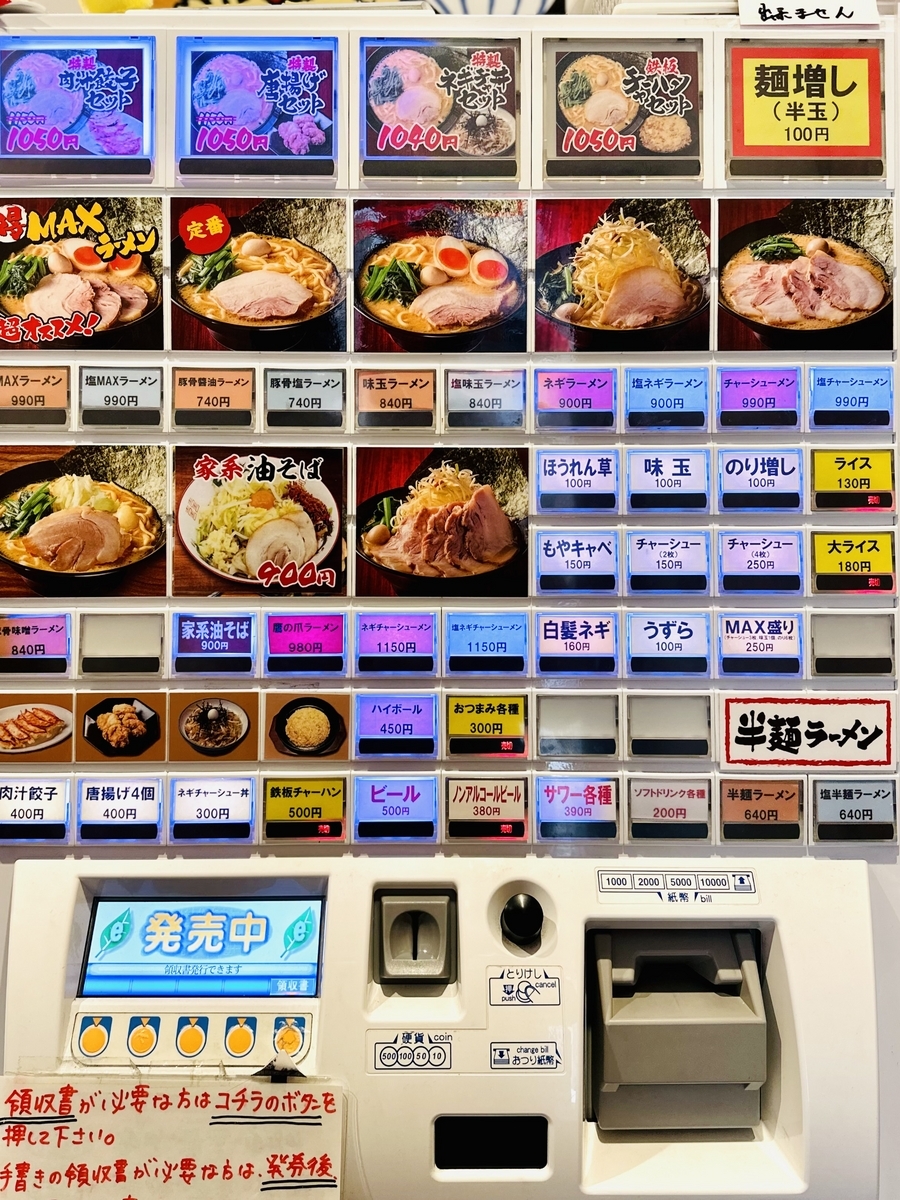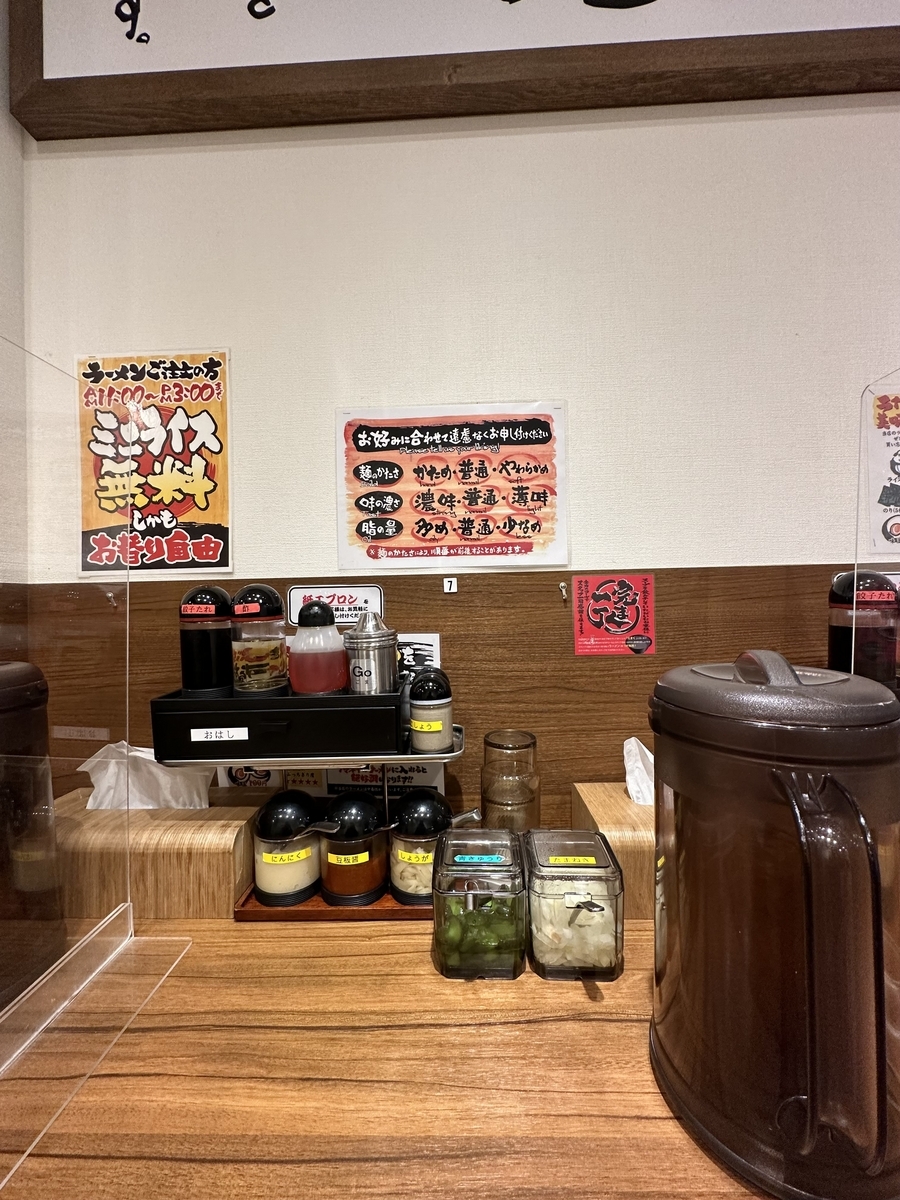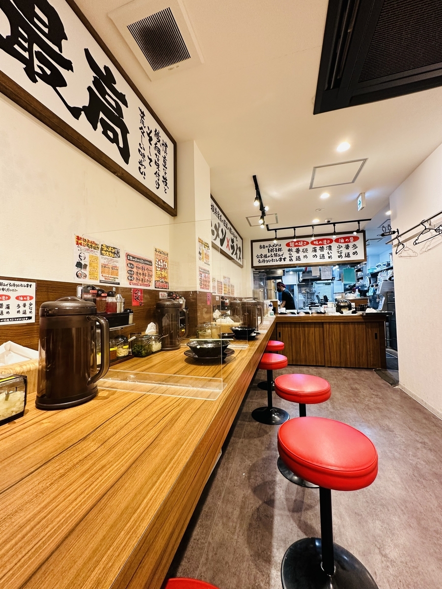 外観は赤看板に黒文字の「横浜家系らーめん」デザイン!店内はカウンター席のみ!こだわりや家系ラーメンの食し方などが掲示されています〜入店したら券売機で2種類の「醤油or塩」を選び好みのトッピングを加えるといったチョイスの仕方です。