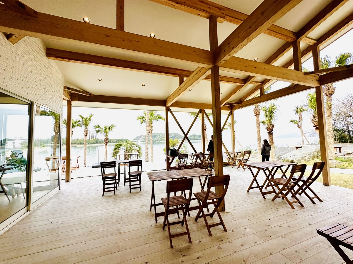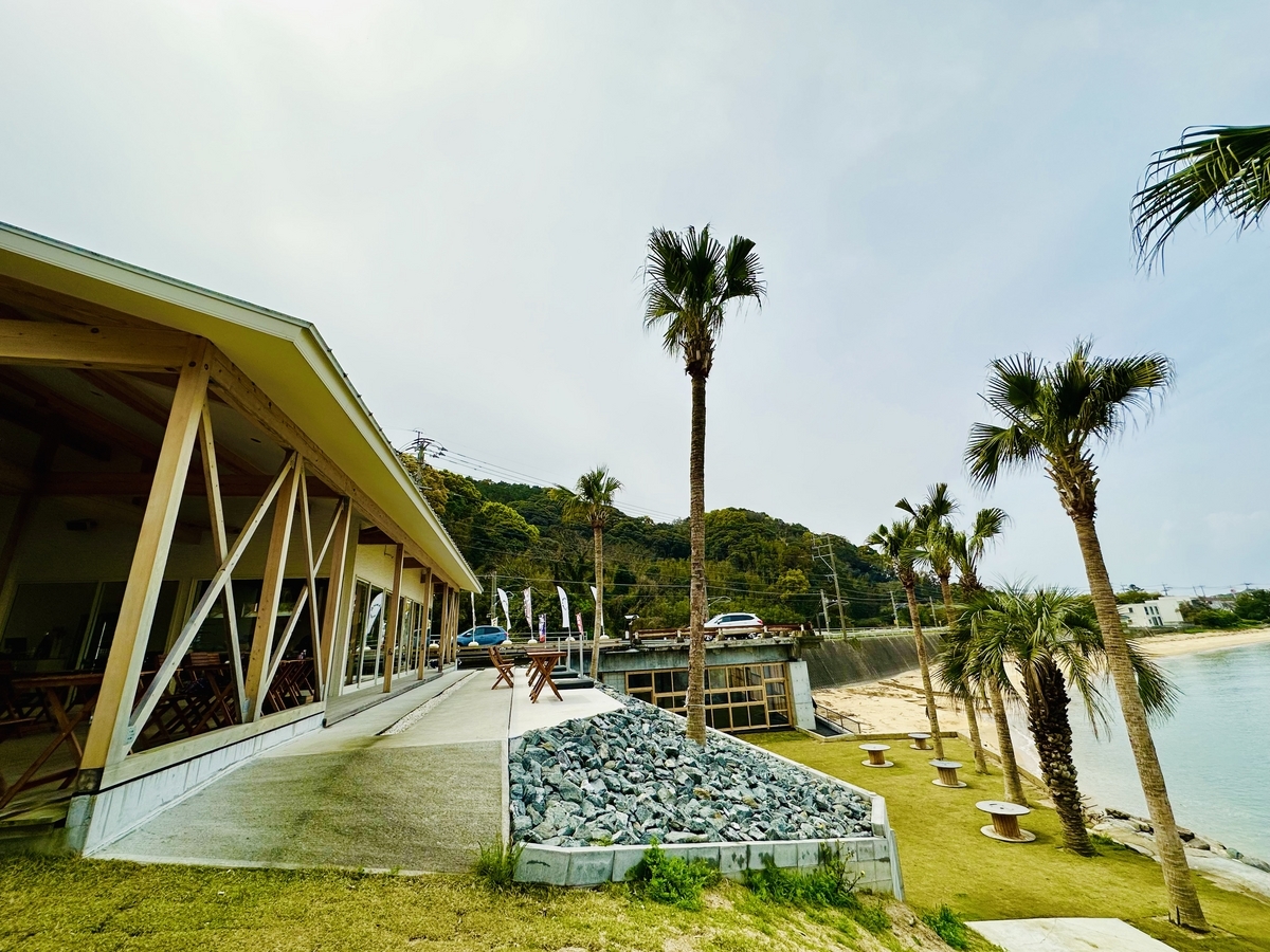 外観はヤシの木に囲まれた海沿いに建つリゾートレストラン☆開放的な店内からテラス席と、全てが「大入海岸」を望める好立地!天気良い日はテラス席が最高です☆訪問した日は少し曇りでしたが、大入海岸のエメラルドグリーンが綺麗で海外リゾート地に来たかのような錯覚に陥ります。