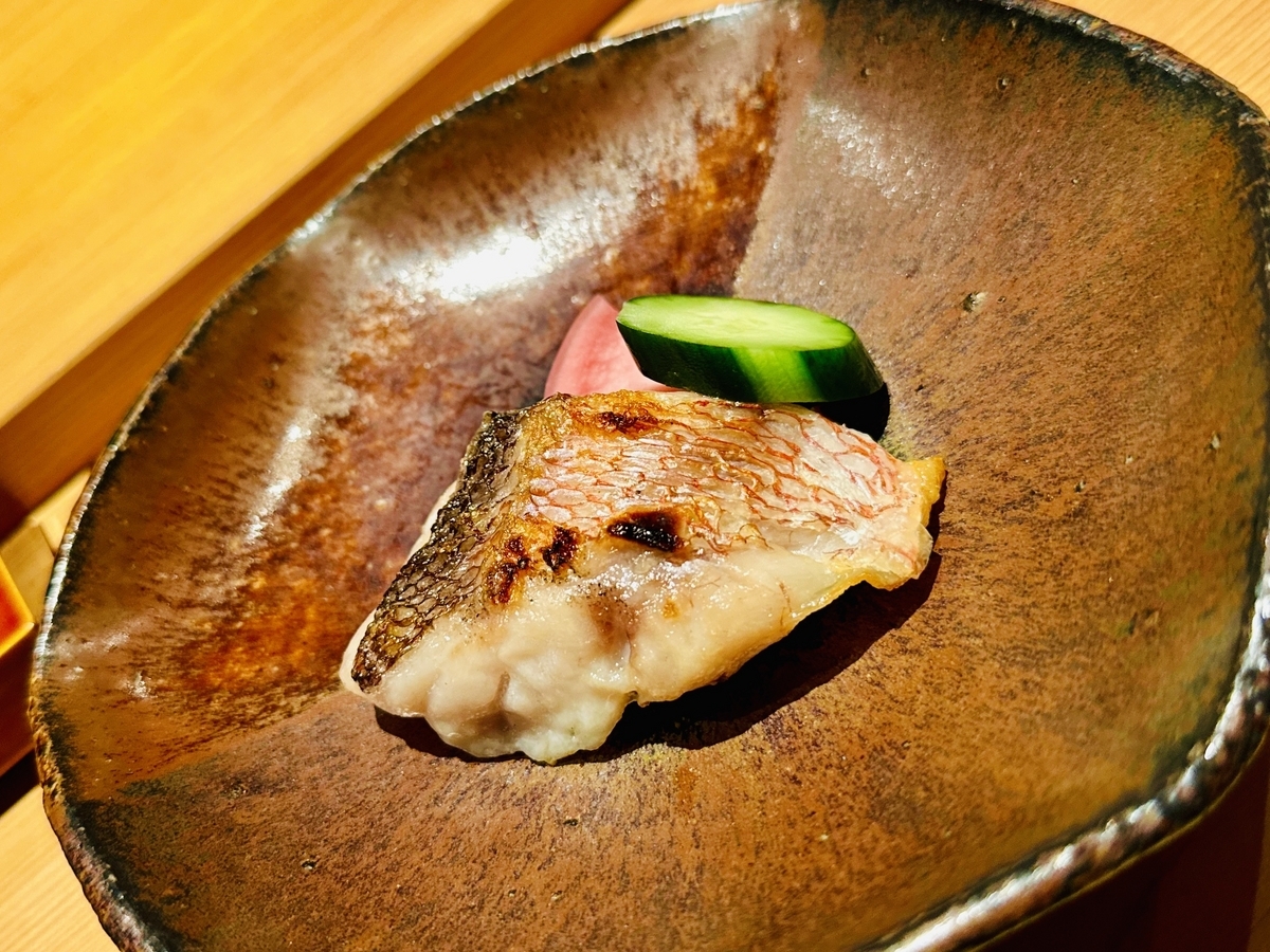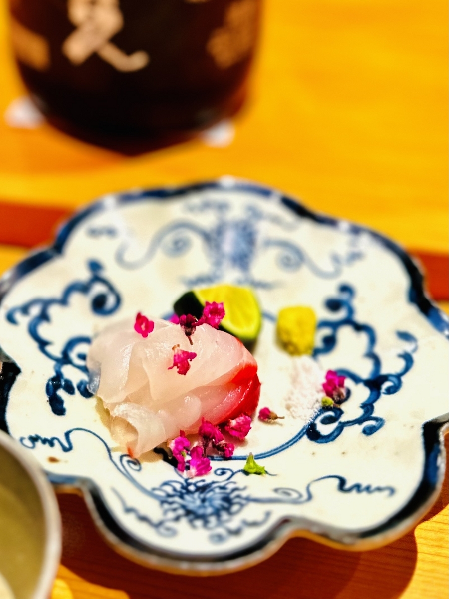 「甘鯛」「あん肝と奈良漬」と料理に合わせて、ソムリエによる日本酒やワインのペアリングをお任せしてみました!ペアリングした日本酒は「日高見/純米吟醸」で芳醇な美味しさが甘鯛やあん肝とマッチして美味しく頂けました。