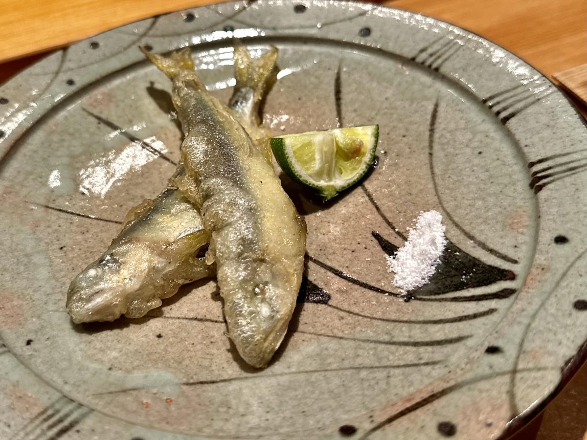 次に「毛蟹」「ネギトロ」「稚鮎の天ぷら」と続いていきます〜「毛蟹」はカニの身が食べやすくほぐしてあって圧巻の美味しさ!「ネギトロ」は赤酢の程よさとマグロの濃厚な美味しさが堪らん!「稚鮎の天ぷら」はサクサク!苦味も美味しい至高な味わいです。