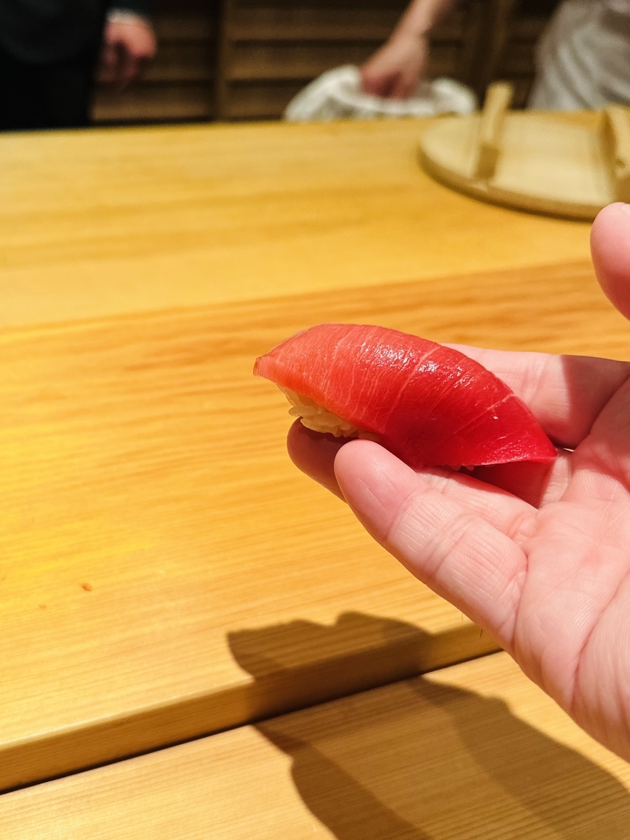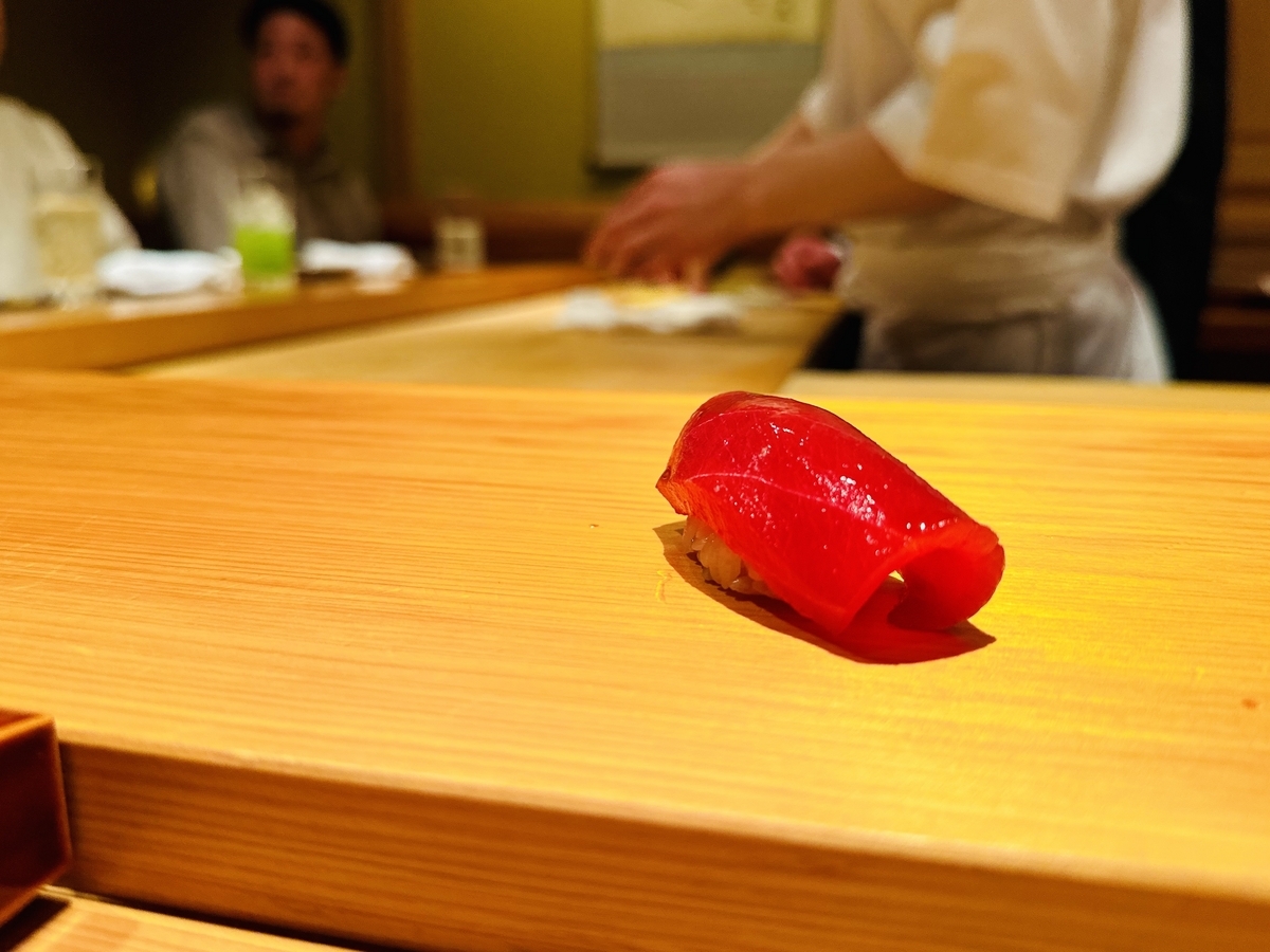 メニューは「おまかせ」のみで、つまみが8品前後、握りが12品前後の構成となっていて、近郊で獲れる鮮魚からこだわりの高級食材は全国から空輸されてくるという〜特にマグロはマグロ専門仲卸「やま幸(やまゆき)」から仕入れているから間違いないでしょう。