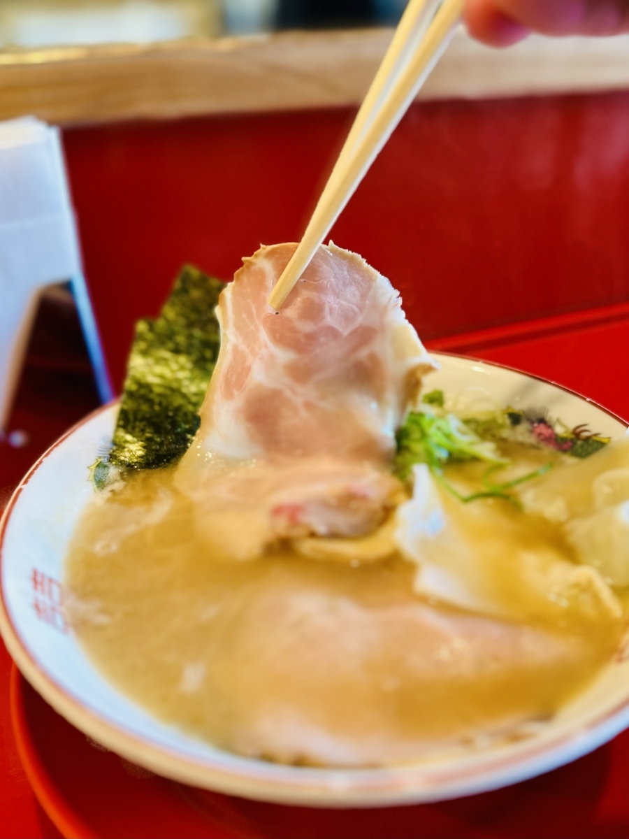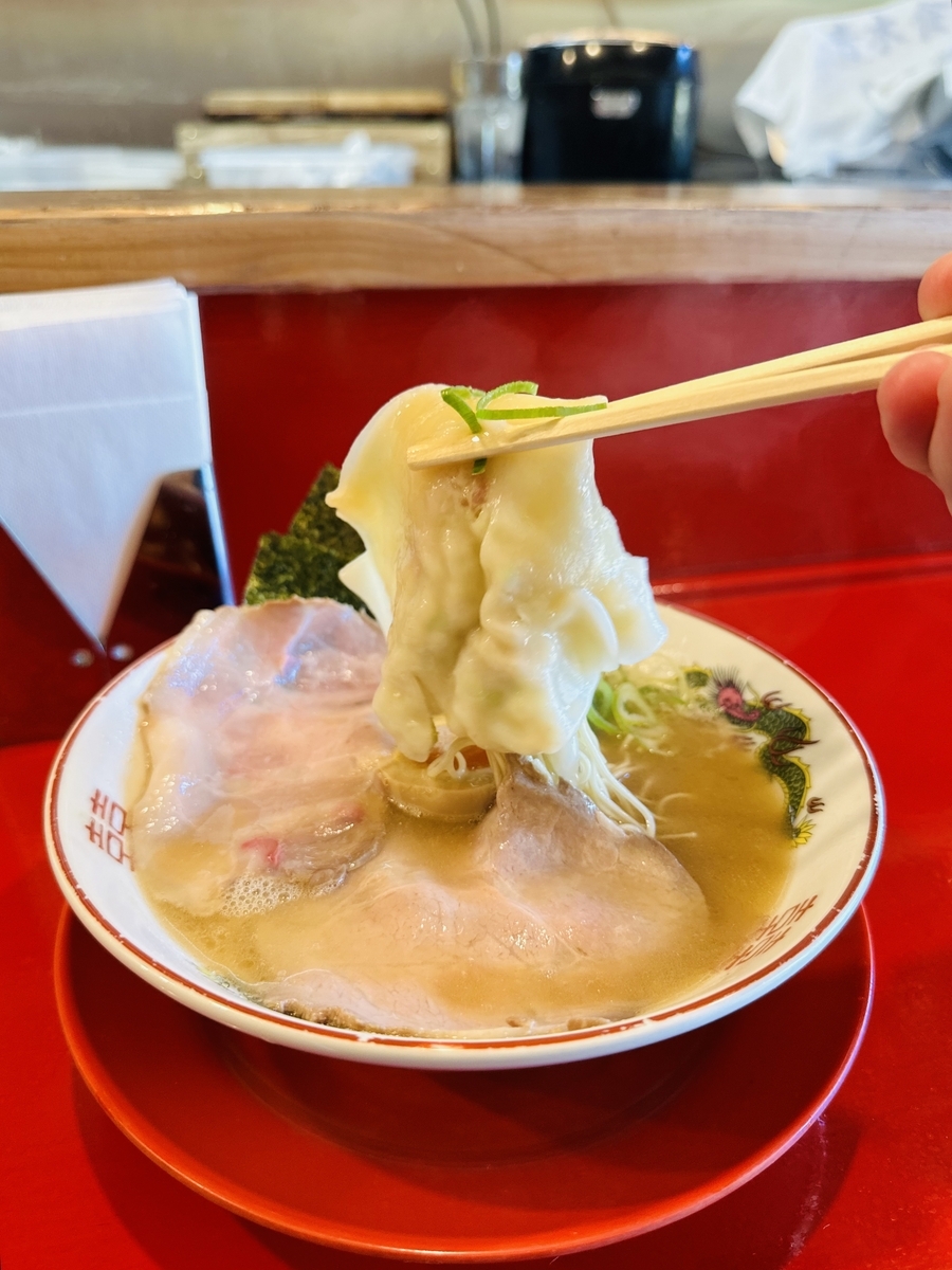 豚骨ラーメンの作り方はを拝見していると、寸胴で炊き上がった上層部のラード脂を「ちょい入れ」てからスープを注ぎ込むといった作り方は佐賀ラーメンに近い仕様でしょう〜麺は細麺低加水でパツんとした食感は豚骨スープにマッチして美味しい!チャーシューは豚ロースでいい塩梅!ワンタンは美味しいけど皮は薄めが好きだな〜全体的にバランスの取れた美味しい豚骨ラーメンでした。