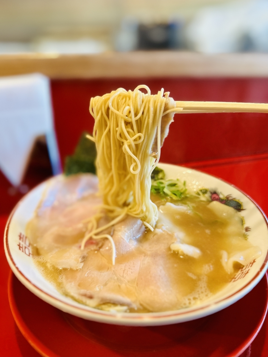 先ずはスープから〜良いね☆豚骨旨味がしっかりと炊き出されたコク旨いスープに、エッジの効いた塩分とキレのあるかえし醤油がバランスよく美味しい!豚骨旨味をしっかりと引き立てる仕上がりとなっています!これはレベル高い豚骨スープですよ〜諸先輩方を押しのけての2023年福岡「豚骨ラーメン」トップランカークラス候補店になることは間違いありません。