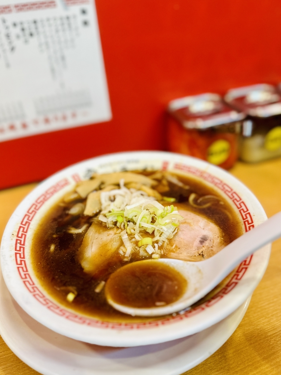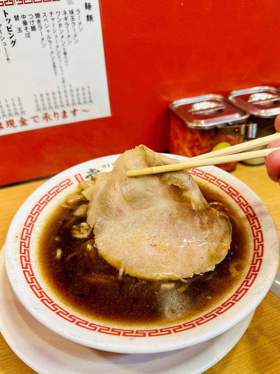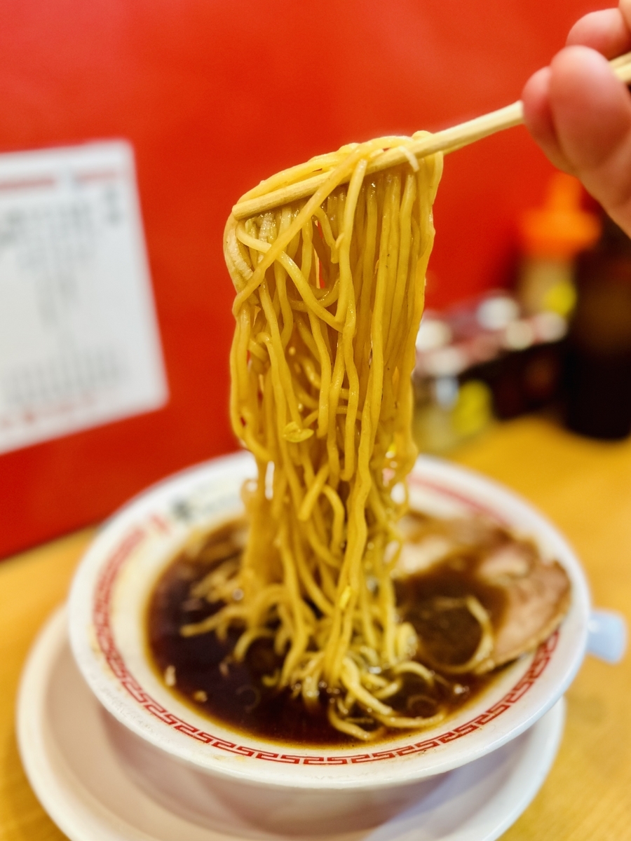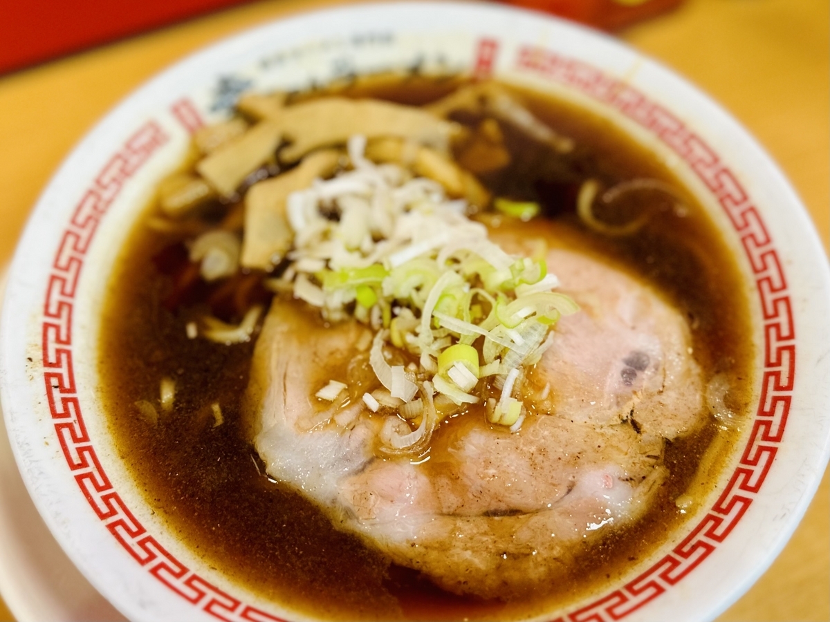 先ずはスープから〜富山ブラック?!と思わせるような漆黒スープが滋味深い味わいで美味しい!ベーススープは鶏がらメインで塩味もかえし醤油のバランスもいい塩梅ですね〜この醤油ラーメンであれば、同伴者が豚骨苦手な場合に効力を発揮するラーメンです!麺は中太麺の加水率まぁ高めなもっちり系な美味しい麺!チャーシューは大判豚ロース!メンマ!白ねぎとシンプルな出立ちながら印象深く残るラーメンでした。