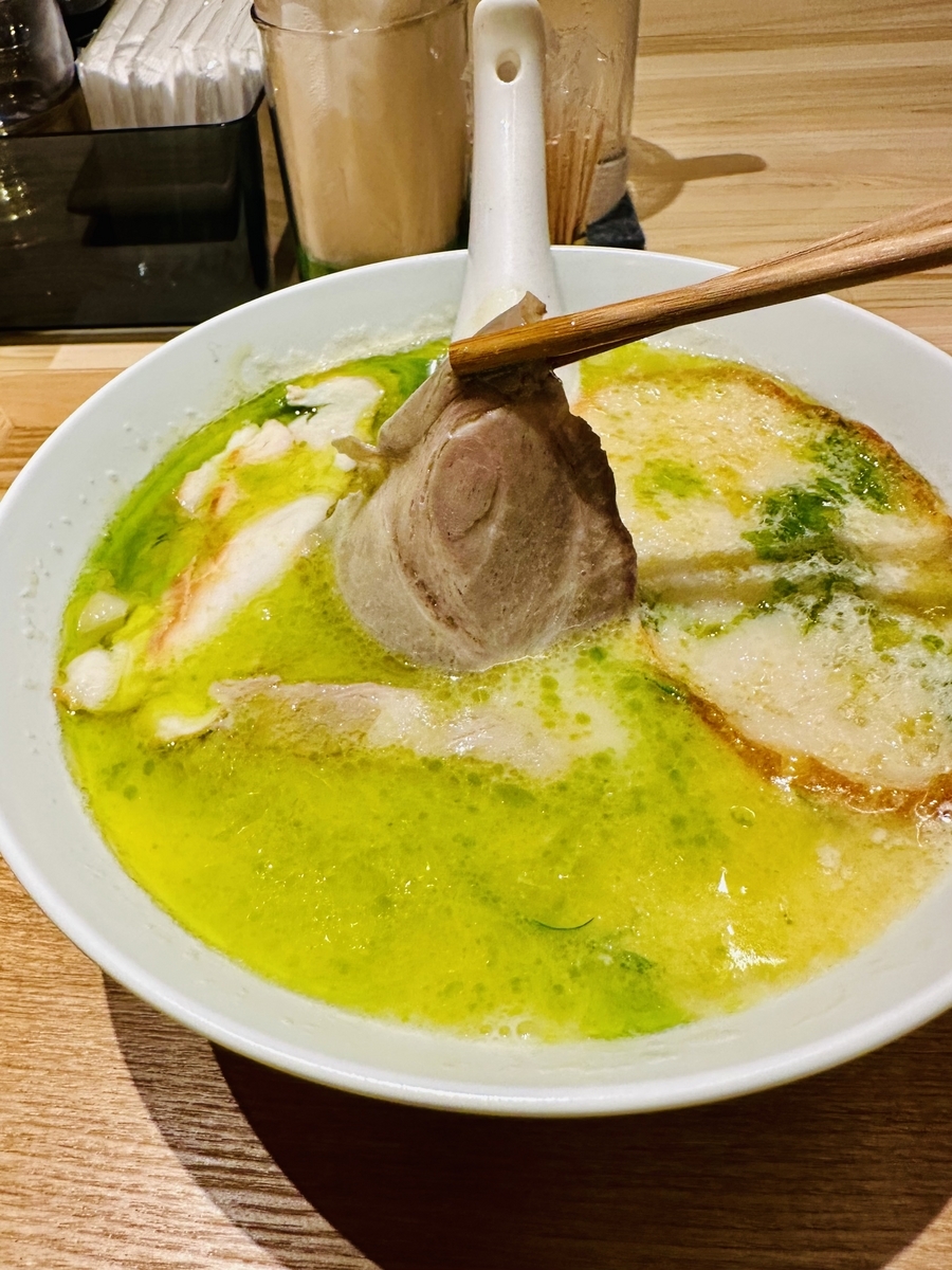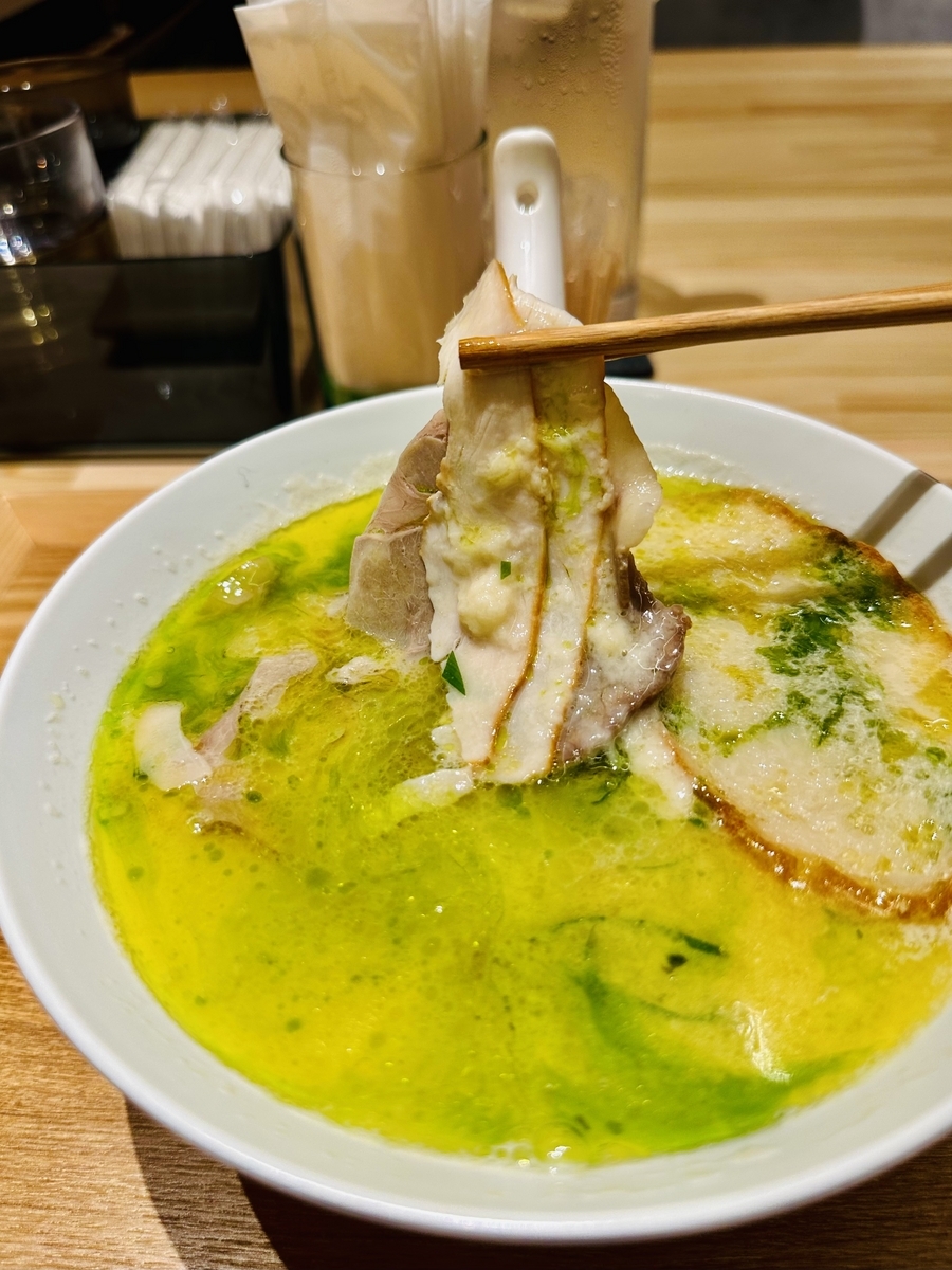 「麺」は加水率高め!太麺全粒粉にライ麦がブレンドされた個性強い特注麺で、もっちりとした食感は健在でまずまず、チャーシューは、鶏の燻製チャーシュー、豚肩ロースのチャーシューの2種類!パンに九条ネギ!ネギオイルがいい塩梅でした。