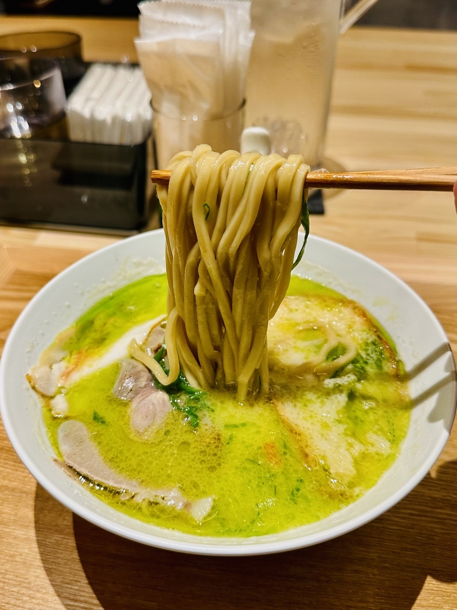 頂いたのは、新作「クリーミーとんこつラー麺」です!先ずはスープから〜シャバシャバ系スープの何をクリーミーと表すかによるが、期待した豚骨クリアな「豚骨旨味」が滋味深い味わいかと思いきや、クラムチャウダーのような洋風スープとしか感じ取れない!和風出汁、肉と香味野菜からとるブイヨンにあわせ、数種類のチーズがブレンドされているからか、輪郭のないボヤけた味わいになるんだろう!豚骨と銘打つなら「豚骨旨味」をしっかりと炊き出して欲しい〜豚骨はゲンコツを使用して欲しいし、若しくは、鶏ガラ&丸鶏のほうがこのテイストならマッチして美味しくなりそうです。