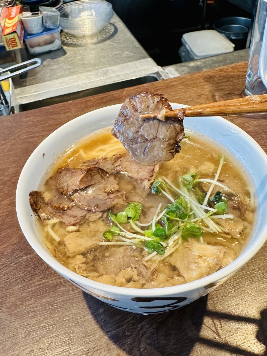 麺は低下水中太麺で、しっかりとスープを持ち上げてくれる!トッピングの尾崎牛チャーシューは、甘く煮付けされ尾崎牛の味がスープに染み出しナイスコラボレーションでした。