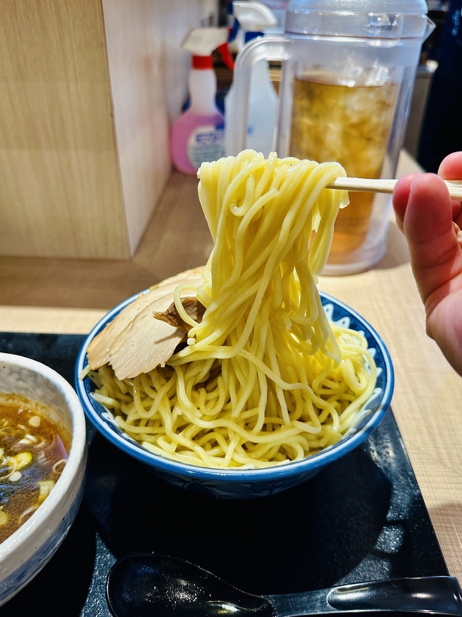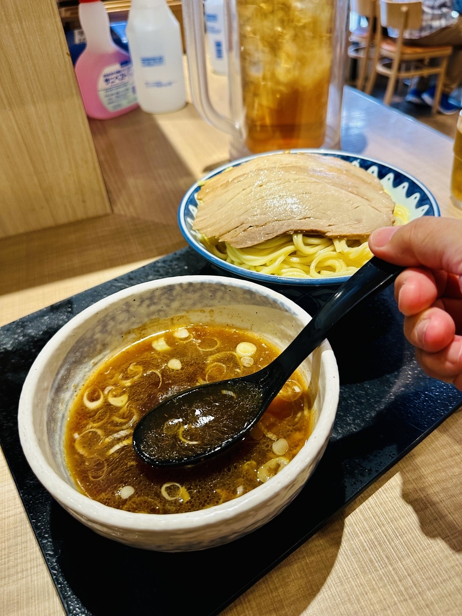 先ずは「つけ汁」から〜節系醤油つゆで、甘みキレのある醤油味で悪くない!麺は中太麺で加水高めのモチモチ麺です!あつもりの麺をつけ汁と合わせズズッと食してみると、最初の一口二口目くらいまでは「まぁ美味しく」食べれるけど、食べ込んでいくとスープが薄くなって不味くなっていく!味濃くする術がないので赤辛味を投入するが、辛味はますけどスープは薄いままで、半分くらい麺を食べると、薄く飽きて食べれなく残して退散しました。