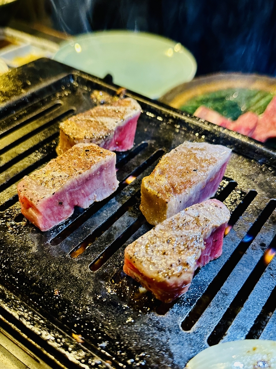 先ずは「ネギ塩牛タン」を堪能して「極上サガリ」を焼きすぎないレア感を残してレモン塩で食す!美味い最高だわ♡見た目も美しい「シャトーブリアン」は熟成された断面のサシに惚れ惚れ♡美味いに決まってる!究極は外側をカリッと焼き!しばし別皿で肉を休ませて、レモン塩で食すとヤバイ!飛ぶぞ!この旨さが口の中いっぱいに広がる☆幸せ!生きていてよかった!最後の晩餐クラスです。