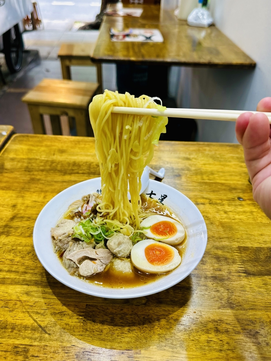外観は通り沿のアーケード街にあり!大きな「鶏そば七星」が目印です☆店内はカウンター席とテーブル席があり!スタッフはタイ人のワンオペです!日本語は喋れませんが、日本の教育が施されている接客サービスを感じます!調理場は店内になく、入口付近にリアル車輪のついた屋台の中で調理されていました。