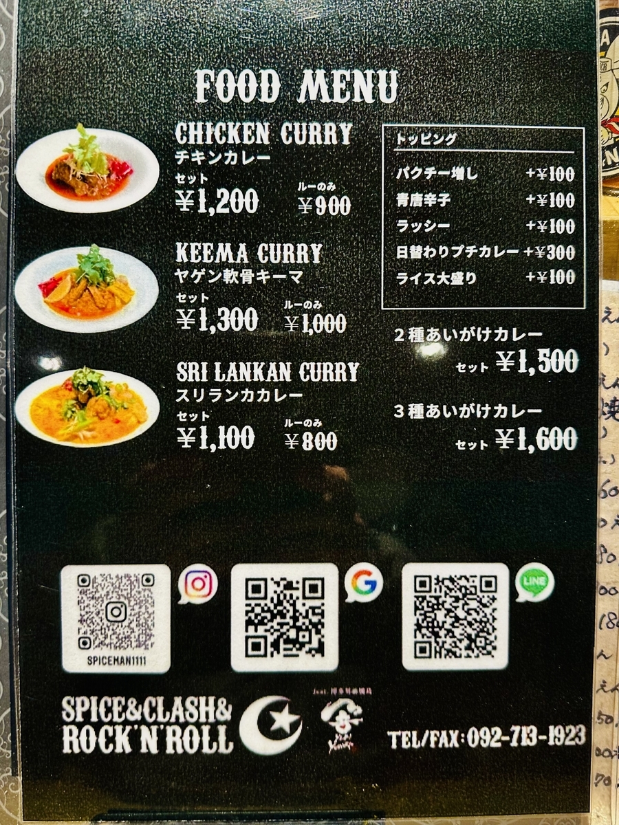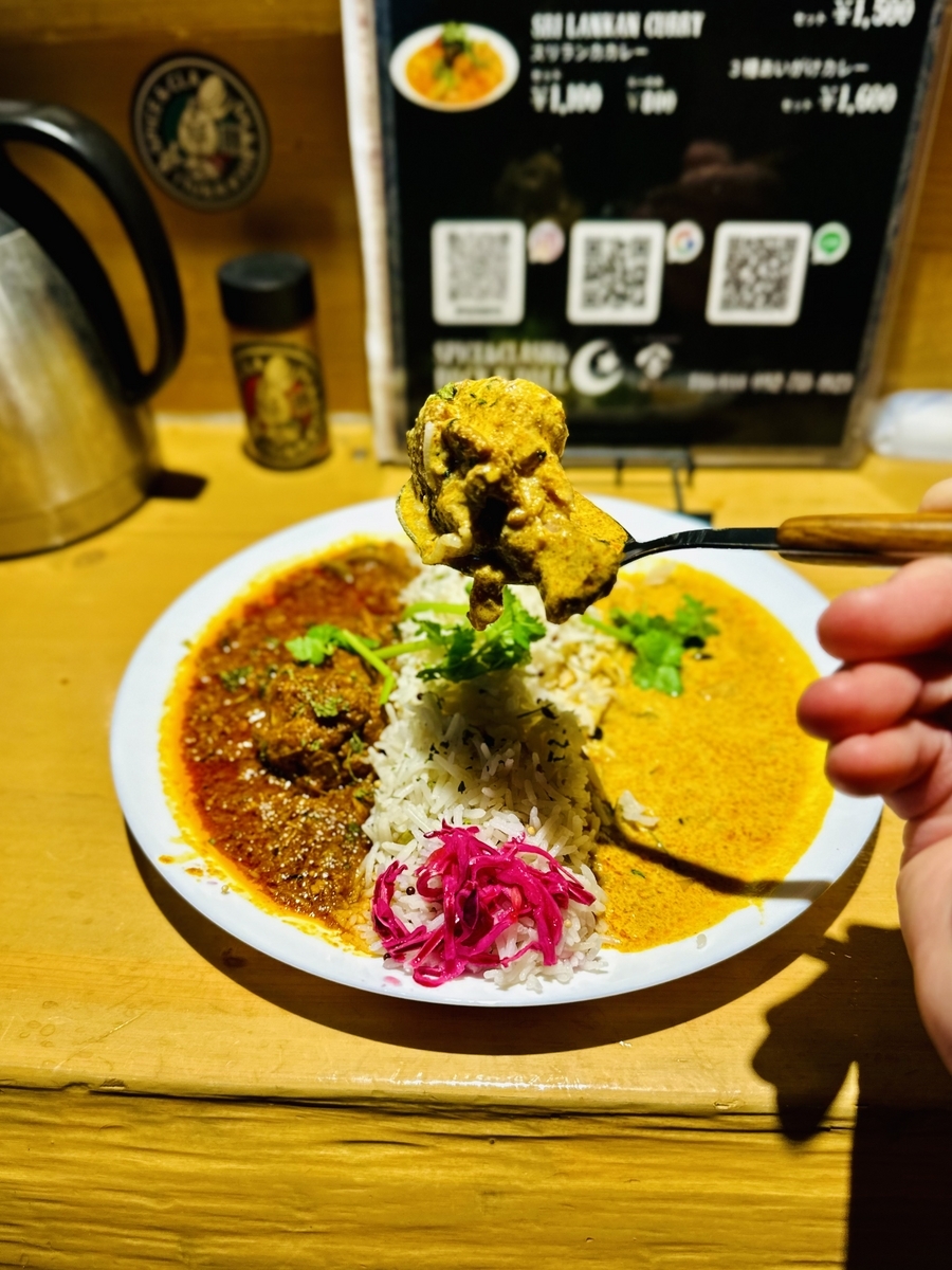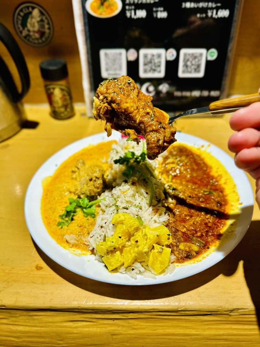 外観は雑居ビル1階!店内はカウンター席とテーブル席とあり、アメリカンロックBARのような雰囲気!しかしながら、カウンターの椅子が高すぎて座りにくいし落ちつかない〜ランチメニューは、3種類のスパイスカレー「チキンカレー」「ヤゲン軟骨キーマ」「スリランカカレー」「3種のあいがけカレー」などがありますが、テレビで紹介された「ヤゲン軟骨キーマ」を食べたかったけど、売り切れていたので「2種のあいがけカレー」チキンカレーとスリランカカレーを頂きました。