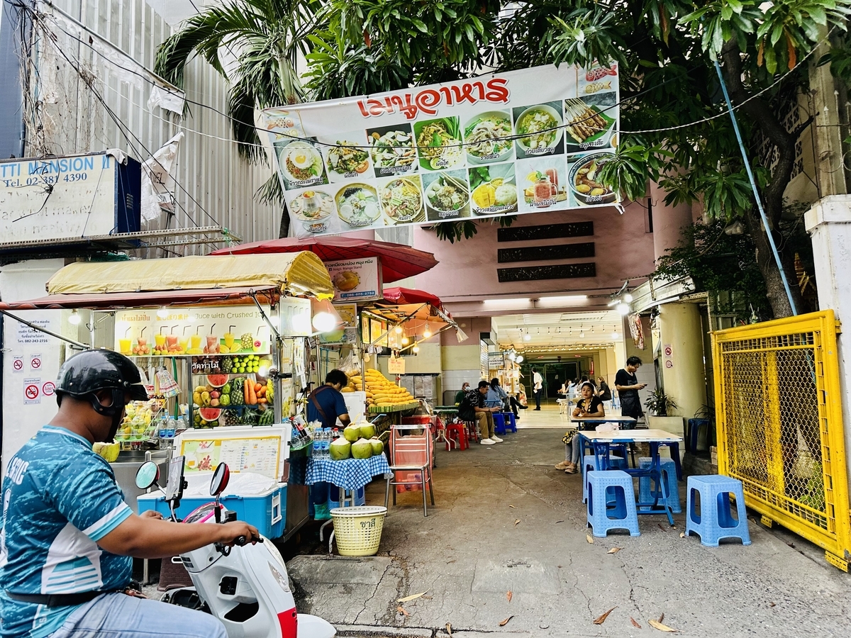 「BTSトンロー駅」改札4番出口階段を下り右手を見ると、明るい屋台が見えてきます!入口には、マンゴーとフルーツスムージーの屋台があり、奥には約10軒くらいの屋台が集まっています!フードコートには、自由に座れる共用のテーブルがあり、様々な店の料理を楽しめます。