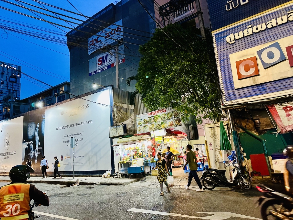 バンコク・トンローの屋台村は「BTSトンロー駅」の目の前、スクンビット・ソイ38沿いのコンドミニアム1階にあります。